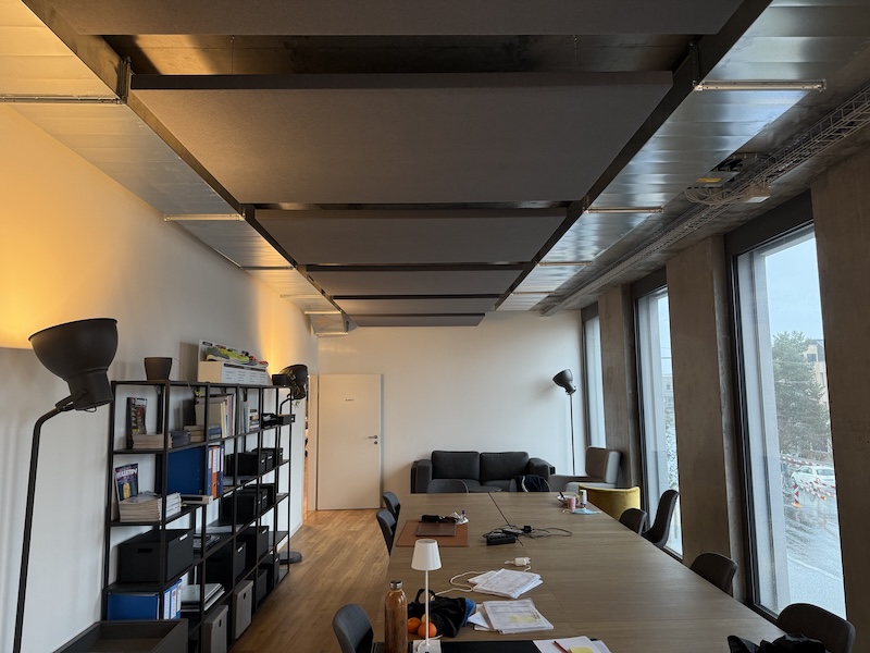 Le cahier des charges prévoyait initialement des panneaux d’un fabricant concurrent. Nous avons proposé d’installer nos propres panneaux acoustiques, fabriqués sur mesure dans notre atelier, en respectant scrupuleusement les dimensions définies par l’acousticien.